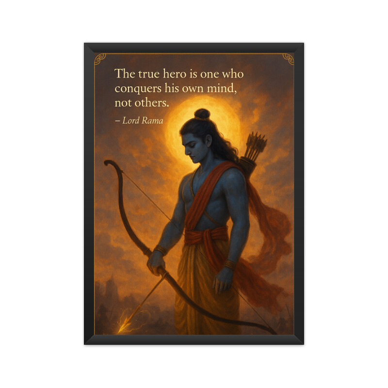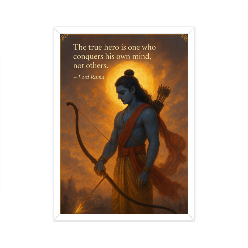 A serene tribute to Lord Rama’s divine wisdom. Featuring the quote: “The true hero is one who conquers his own mind, not others,” this artwork speaks to mastery of the self, calm strength, and noble leadership.