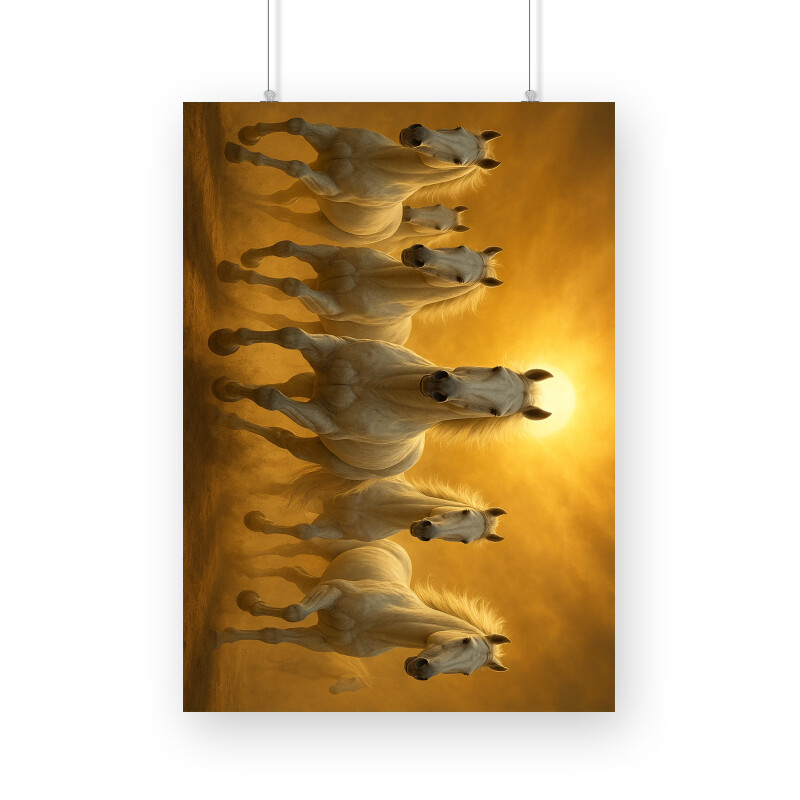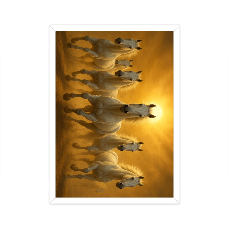 Step into the realm of myth, majesty, and motion with this awe-inspiring artwork of six white stallions charging forward, their manes flowing like streams of light. Illuminated by the blazing golden sun behind them, this scene evokes imagery from ancient legends — from the celestial chariots of Surya (the Sun God) in Hindu mythology to symbols of victory and freedom in world folklore.